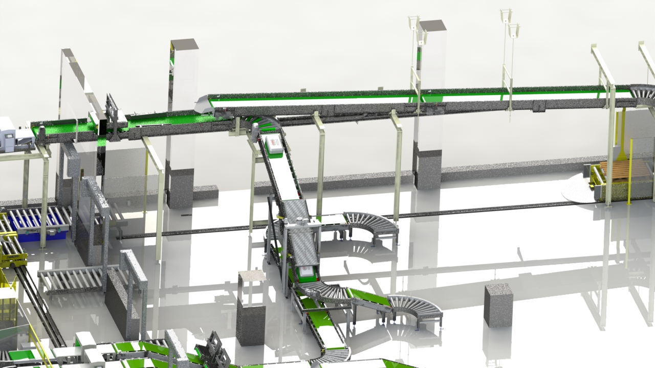 - Flexible Kombinationen – Rollenbahnen, Kettenförderer, Hubstationen, Dreher