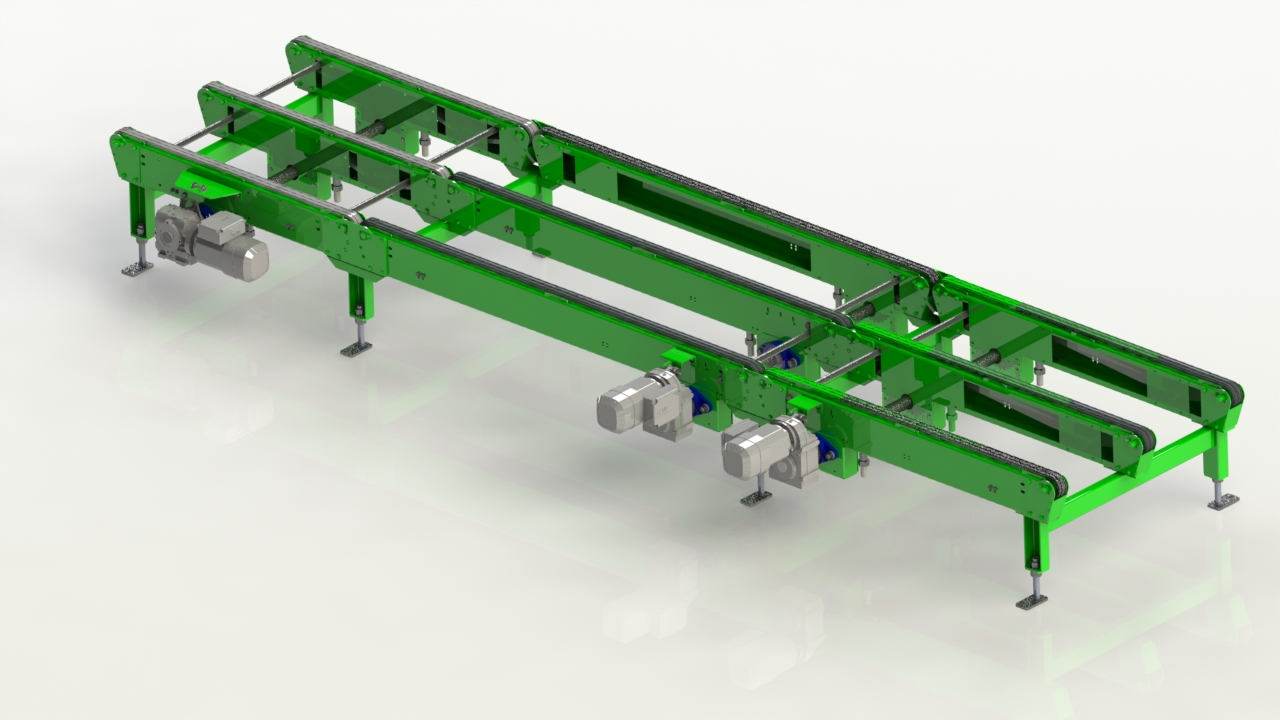 Kettenförderer sind speziell für den sicheren Transport von Paletten entwickelt und übertragen hohe Lasten zuverlässig und gleichmäßig. Durch robuste Doppel- oder Dreifachketten lassen sich Europaletten, Industriepaletten und Sonderpaletten effizient bewegen. Kettenförderer eignen sich sowohl für gerade Linien als auch für Übergaben zwischen verschiedenen Fördersegmenten und sind ein zentraler Bestandteil vieler Palettentransportsysteme.