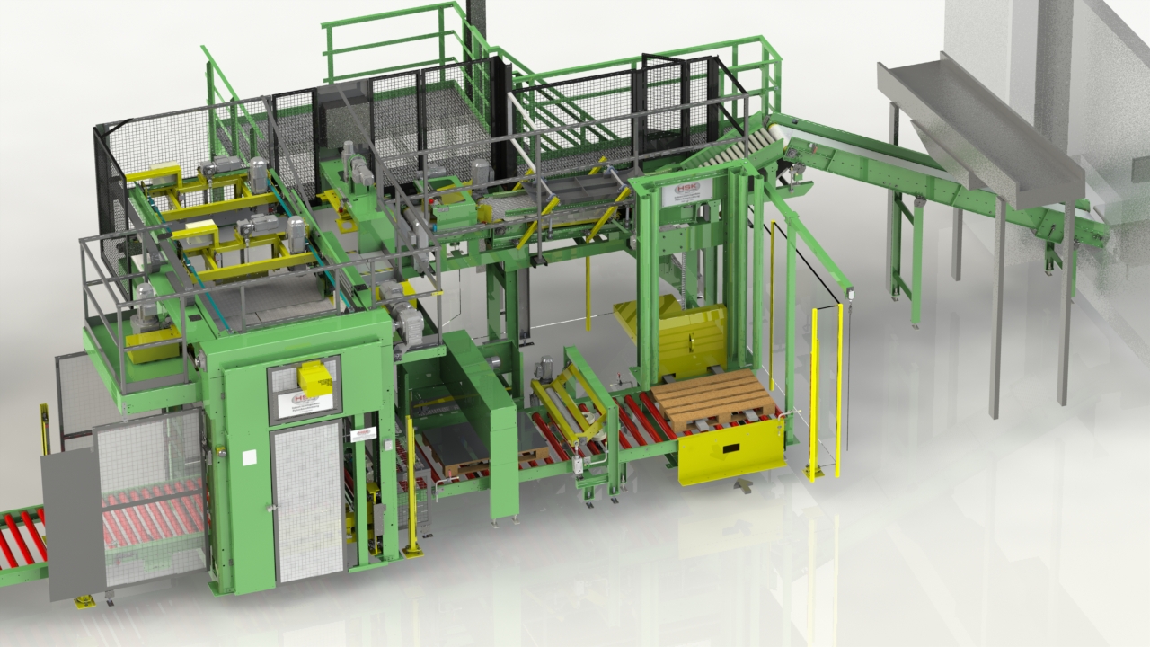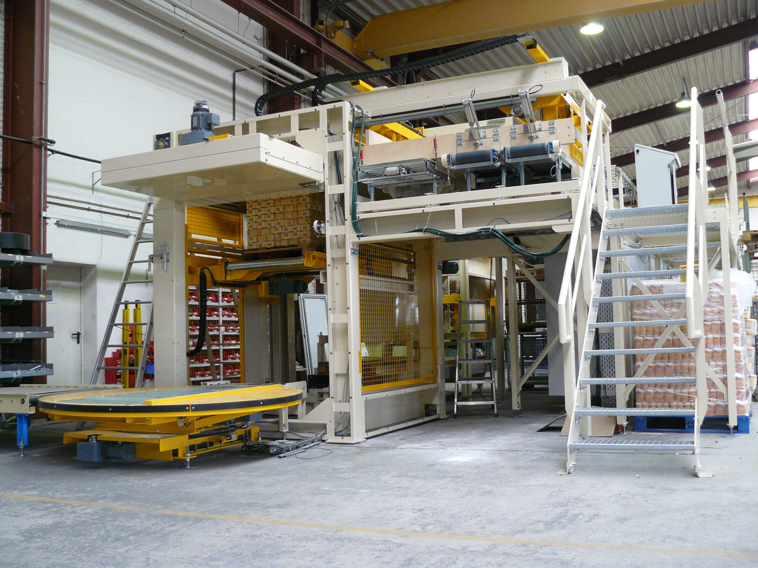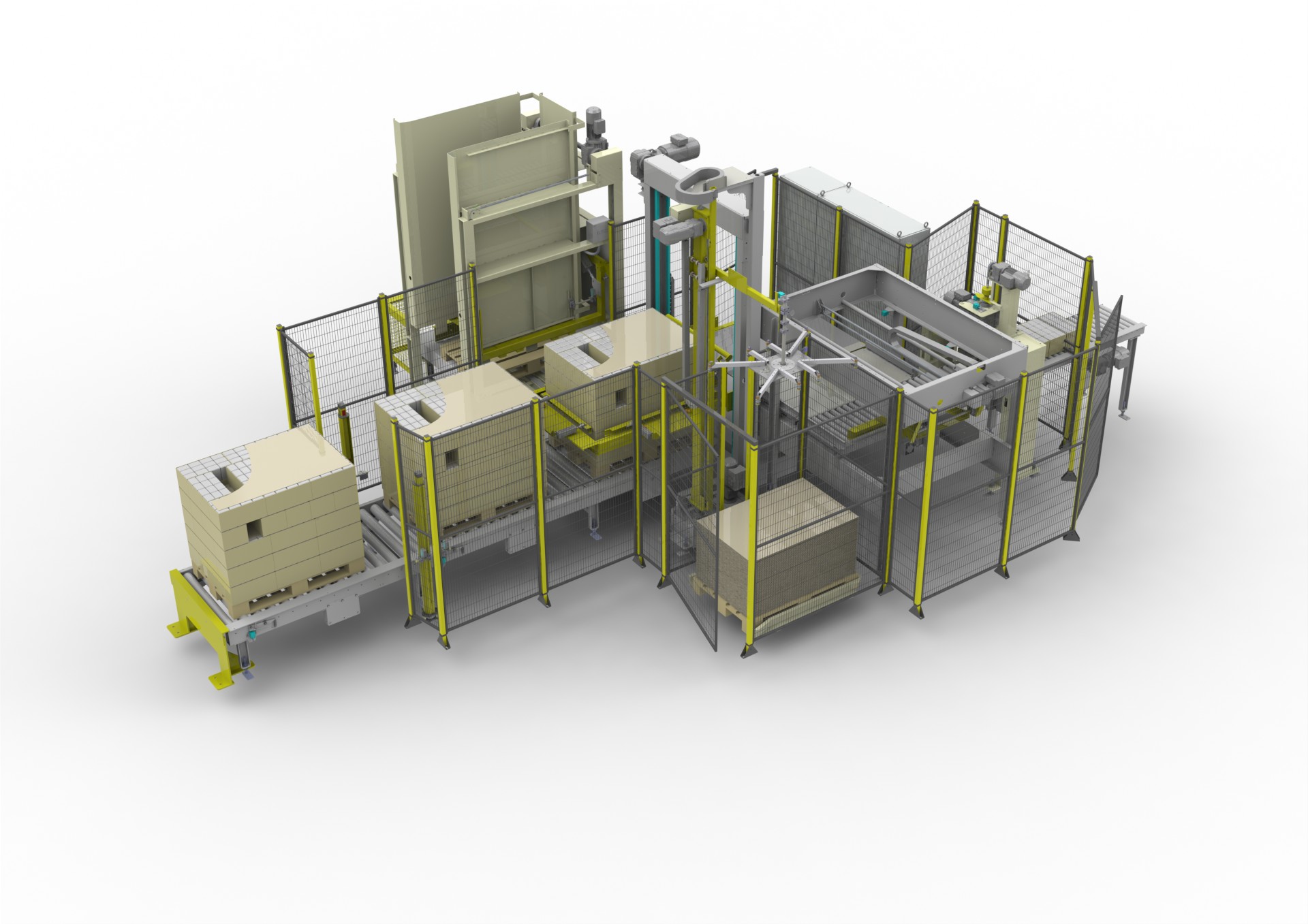 Alle Anlagen verfügen über moderne Drehstationen, präzise Reihen- und Lagenbildung, ein Palettenmagazin sowie optional Bogenaufleger und Leimeinheiten für stabile Palettenbilder.