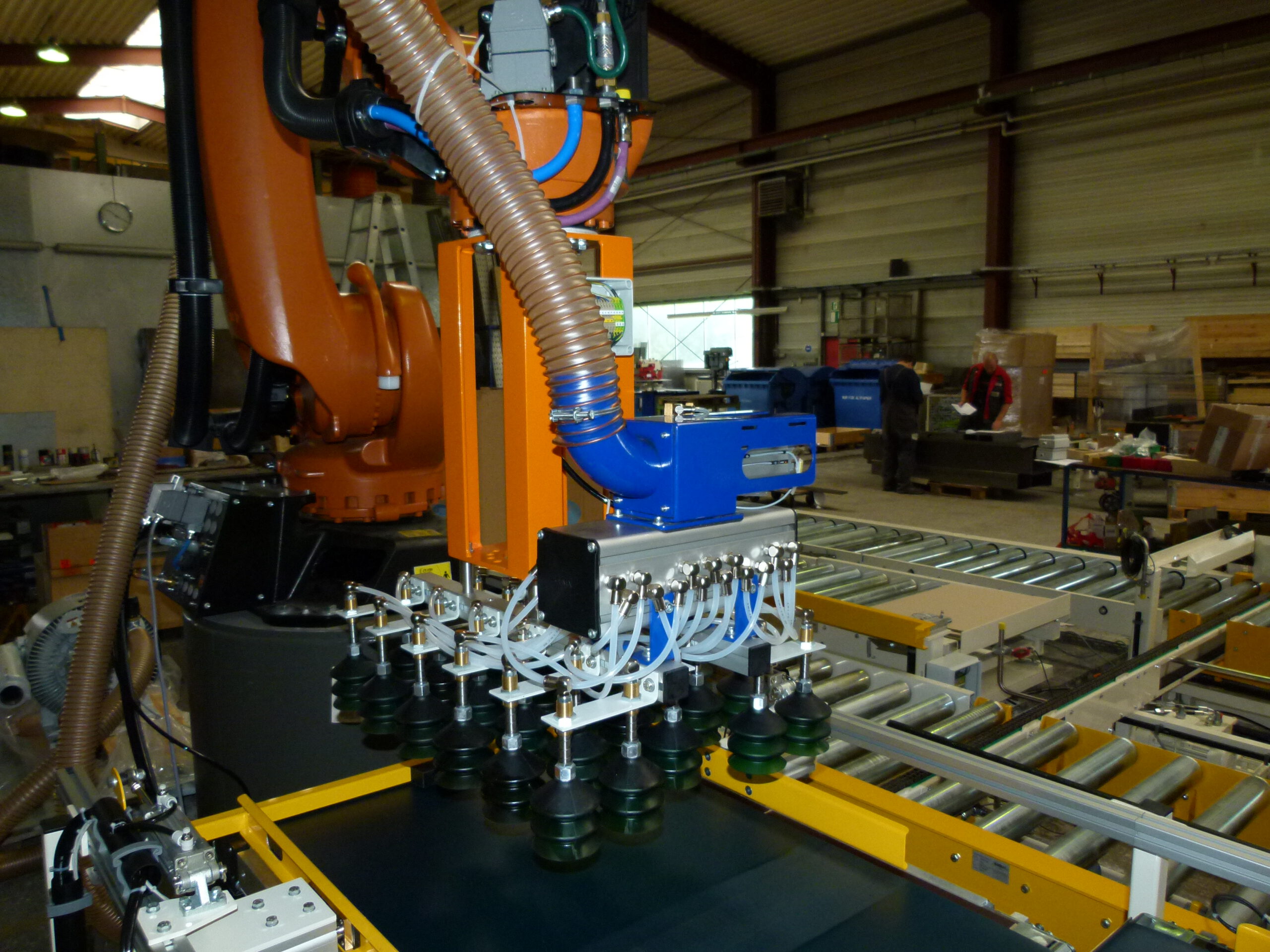 Der Beutelgreifer ist für das Handling leichter bis mittlerer Beutel konzipiert, wie z. B. Kunststoff-, Folien- oder Mehrschichtbeutel. Eine speziell gestaltete Greiffläche sorgt für rutschfesten Halt und gleichmäßige Druckverteilung. Damit können auch empfindliche oder gleitfähige Beutel sicher aufgenommen und abgelegt werden. Der Greifer arbeitet zuverlässig in Kombination mit Roboter- oder Portalpalettierern und unterstützt eine präzise und reproduzierbare Lagenbildung.